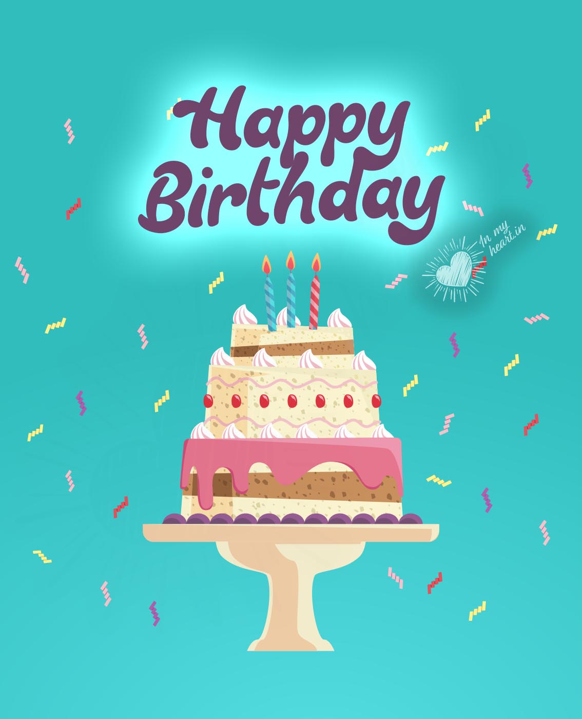 The image is a birthday greeting card featuring a three-layered cake with candles, surrounded by confetti against a teal background. Â The words "Happy Birthday" are prominently displayed above the cake. The overall style is celebratory and cheerful.